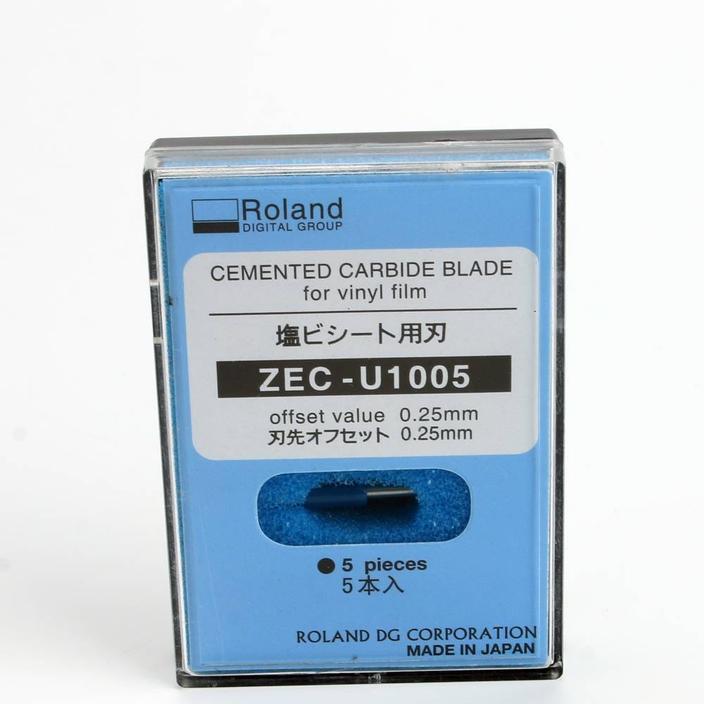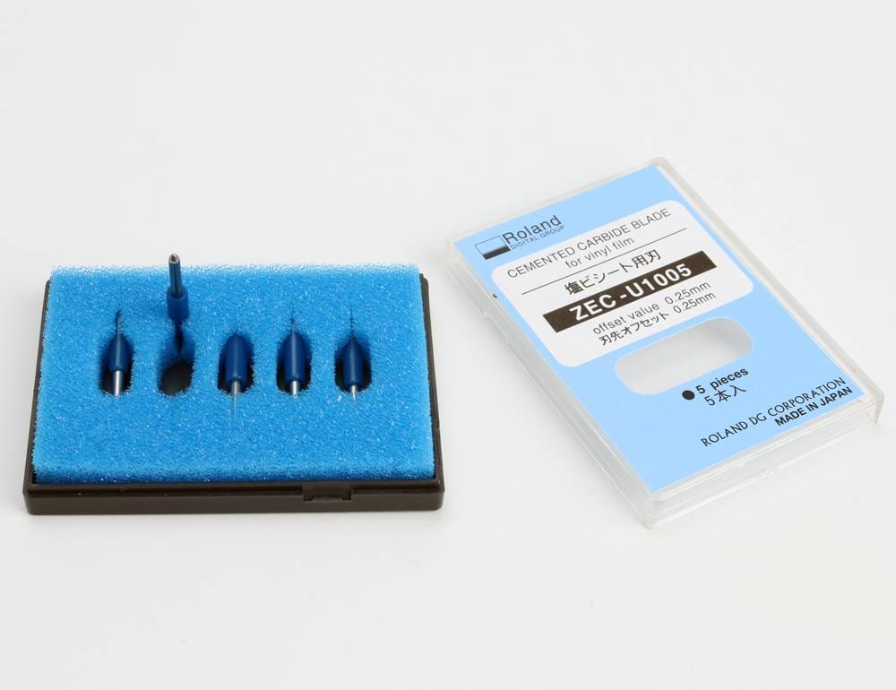 This pack includes five genuine Roland drag knives designed for precision cutting. They feature a 30¡ã wedge angle, a 45¡ã cutting angle, and an offset of 0.25 mm, making them suitable for both standard and flexible vinyl materials. These blades are compatible with any Roland printer that supports cutting functions and are supplied as an authentic Roland spare part, reference ZEC-U1005.